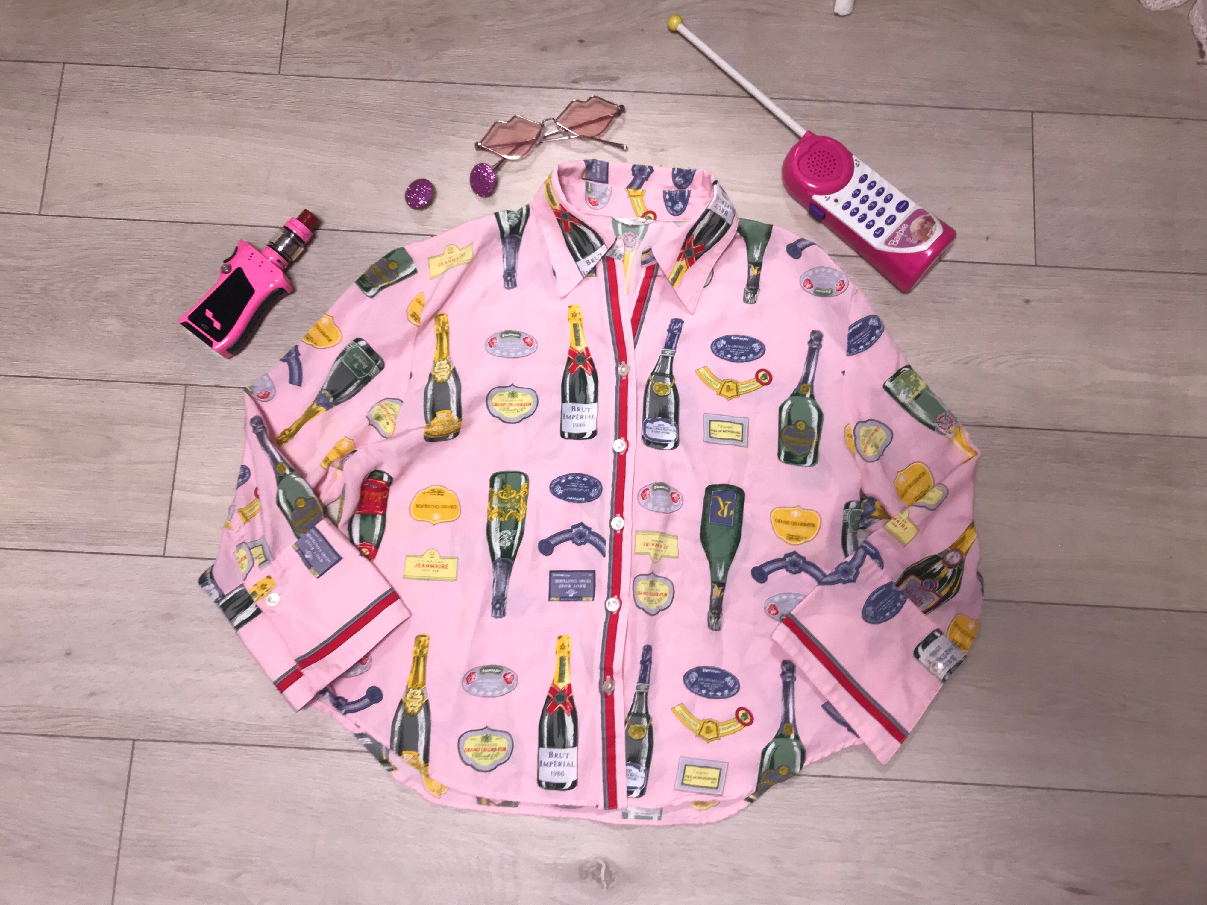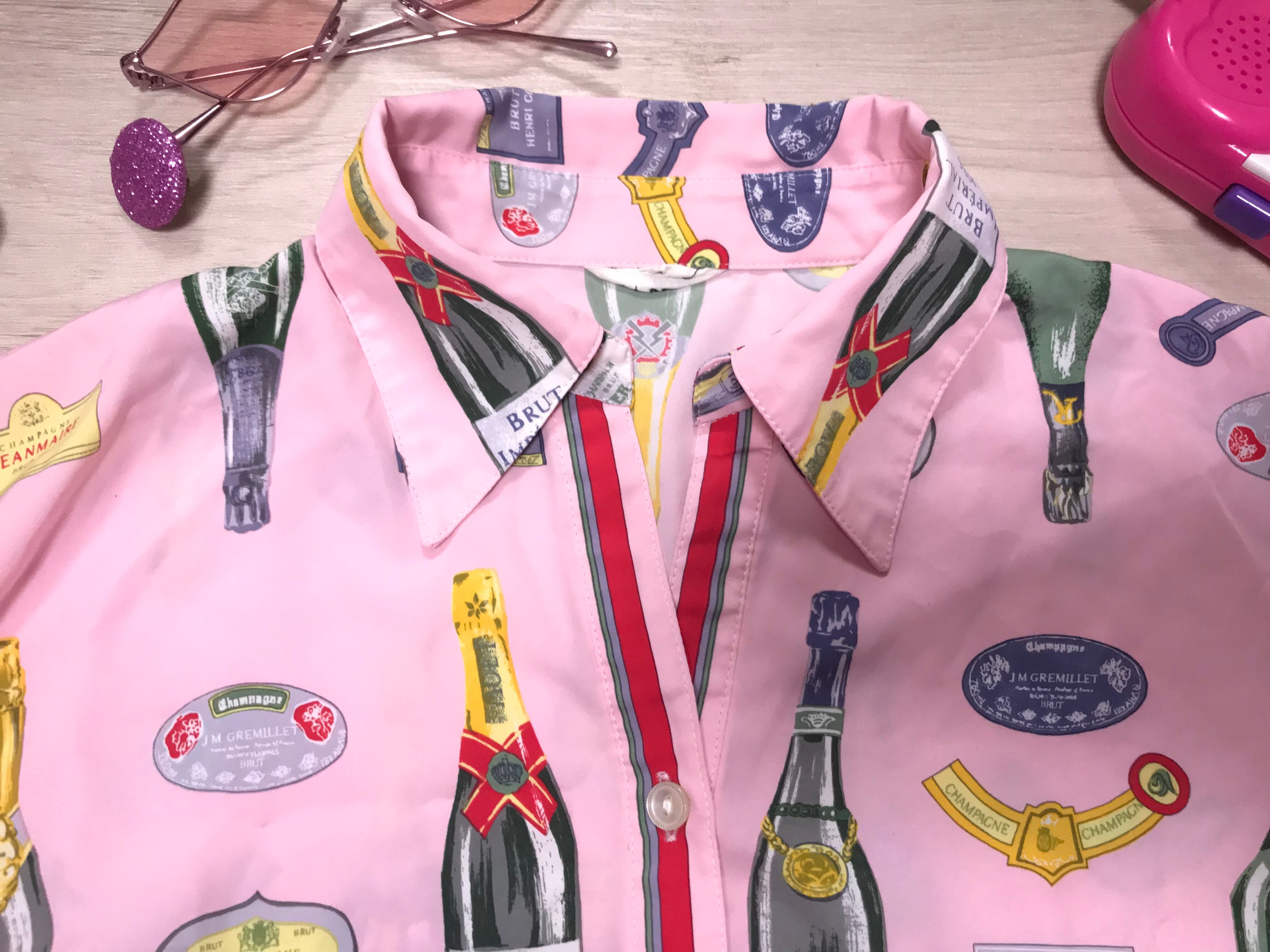 シャンパンのボトルやラベルがプリントされた総柄ブラウスシャツ❤︎