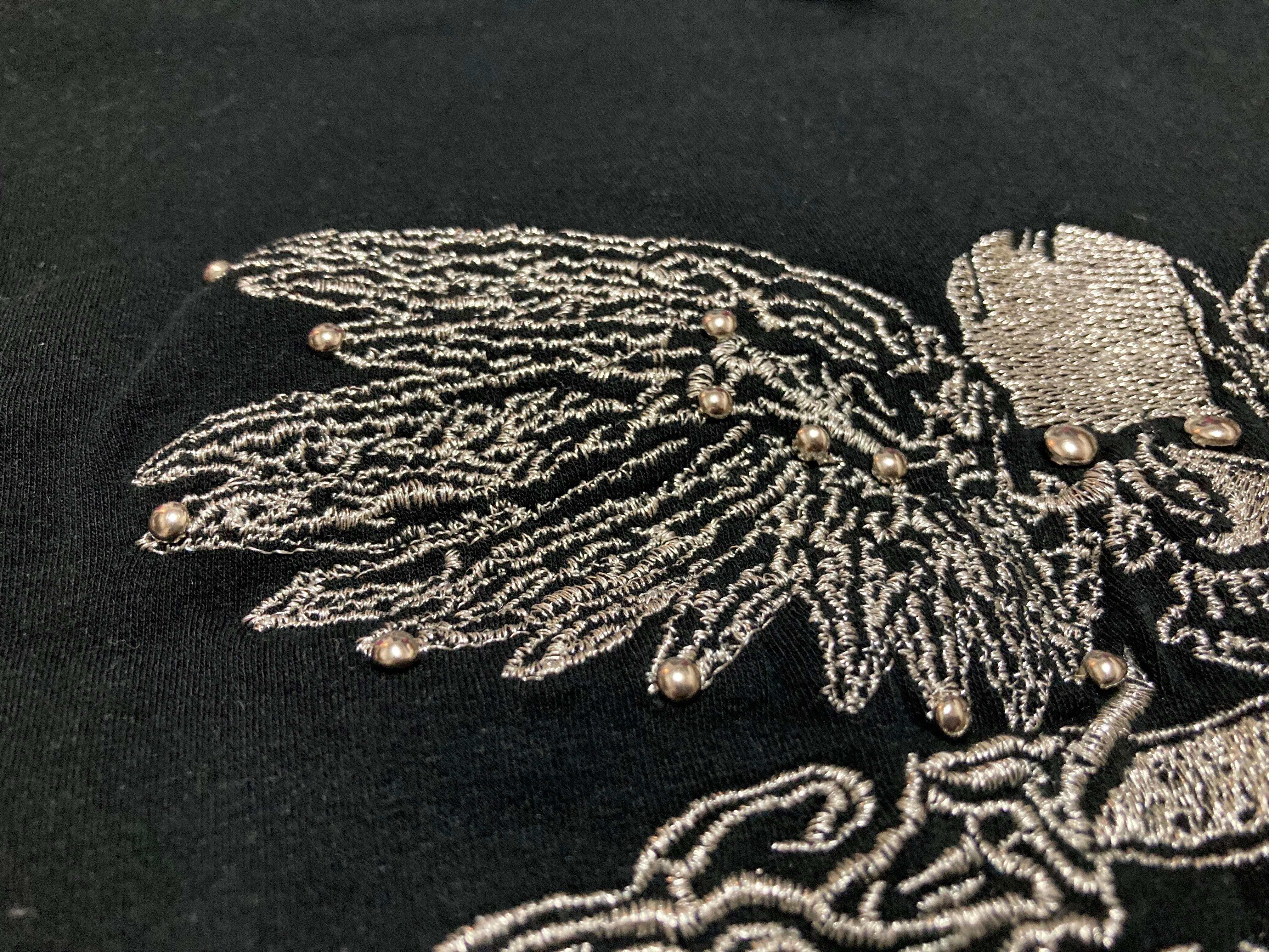 "ラストヴィシャス" ウィング スカル刺繍 丸スタッズライン バッククロスチャームチェーンタイトフィットトップス