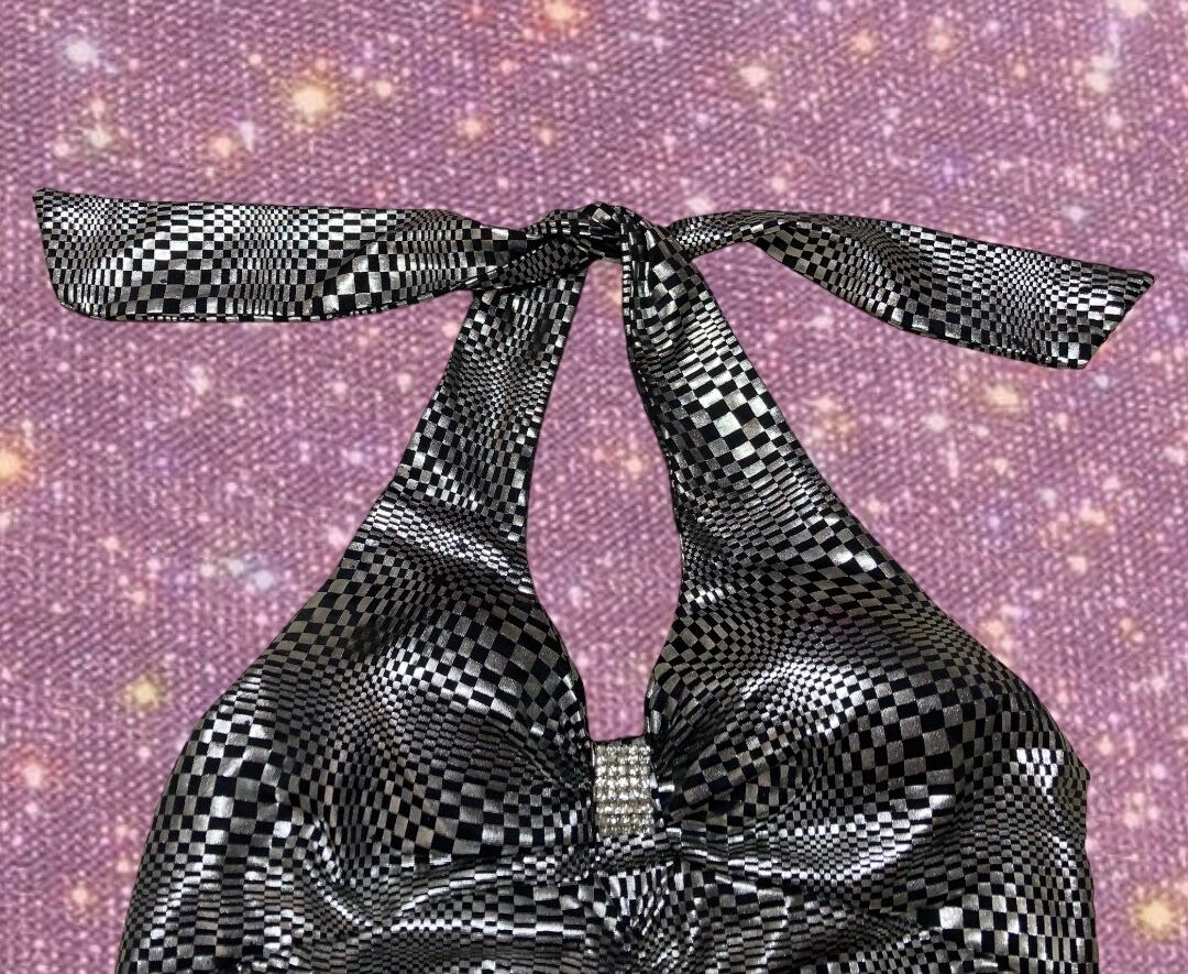 Y2K 00’s McBling DIVA vibes"wink wink" optical graphic metallic halter tops