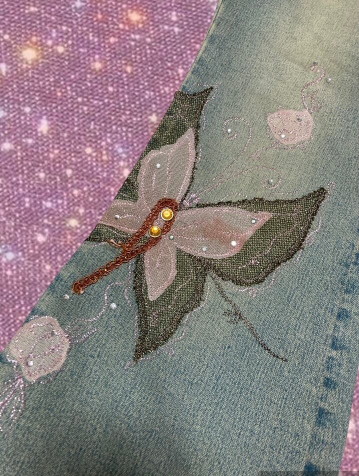 ロマンティック バタフライ パッチワーク 刺繍 ローライズ ストレッチブーツカットデニムパンツ