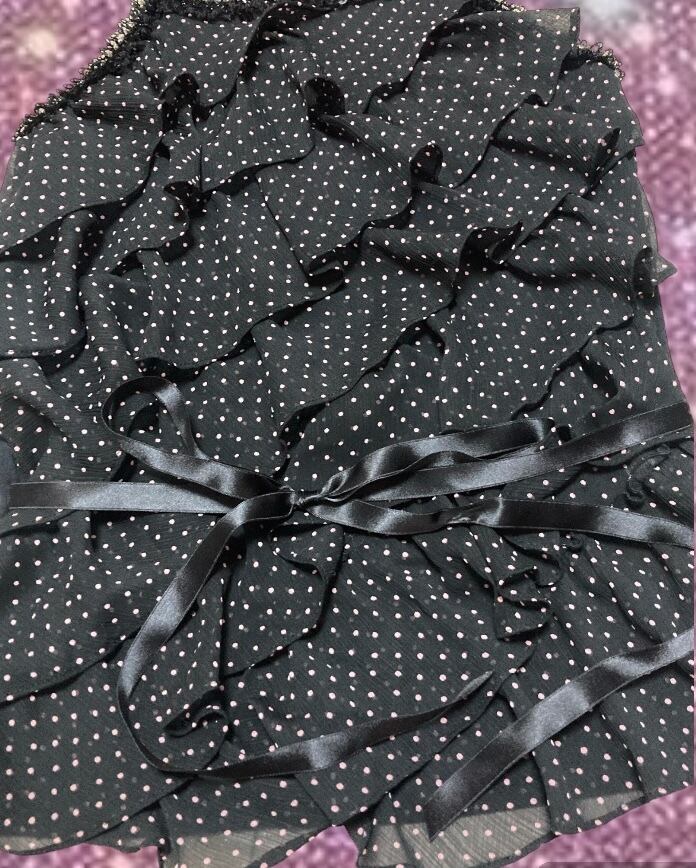 ”メゾピアノ” 水玉ティアードシフォンフリル切り替え バックプリント リボン ホルターネックトップス